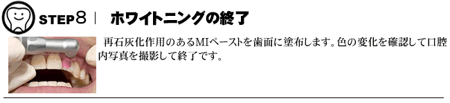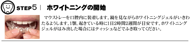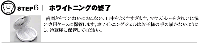 • 使用する薬剤は低刺激ですが歯がしみる場合があります。もししみるような場合があったら、マウスピースをはずすことで落ち着いてきます。